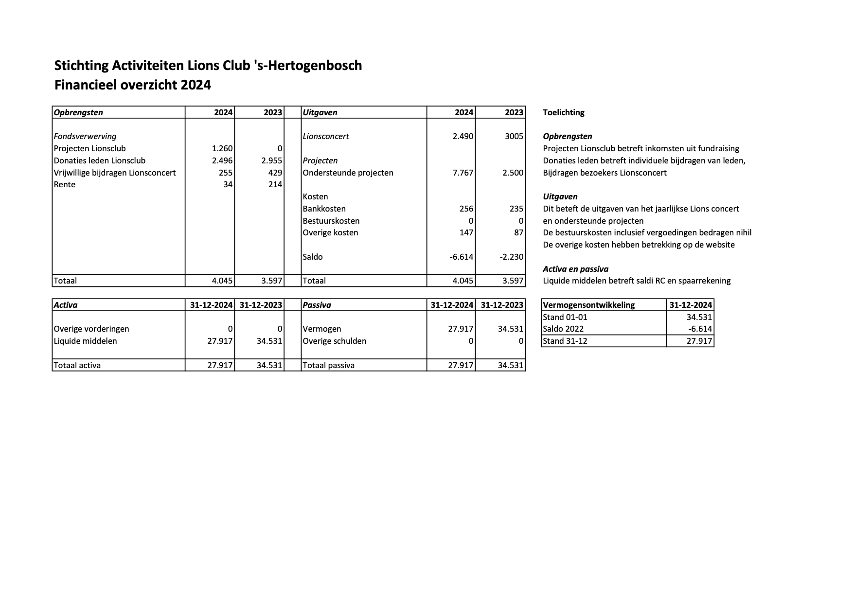 · Schenkingen, bijdragen van donateurs en/of leden van de Lionsclub 's-Hertogenbosch.